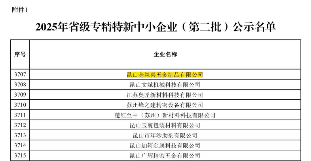 Slovenski हालै, Jiangsu प्रान्तीय उद्योग र सूचना प्रविधि विभागले आधिकारिक रूपमा 2025 को लागि मान्यता प्राप्त Jiangsu विशेष र परिष्कृत SMEs को नवीनतम ब्याच घोषणा गर्यो। Kunshan Jinsixi Metalware Co., Ltd लाई सफलतापूर्वक छनोट गरी "Jiangsu specialized and Sophisticated SMEs" को उपाधि प्रदान गरिएको थियो। उप-क्षेत्र।